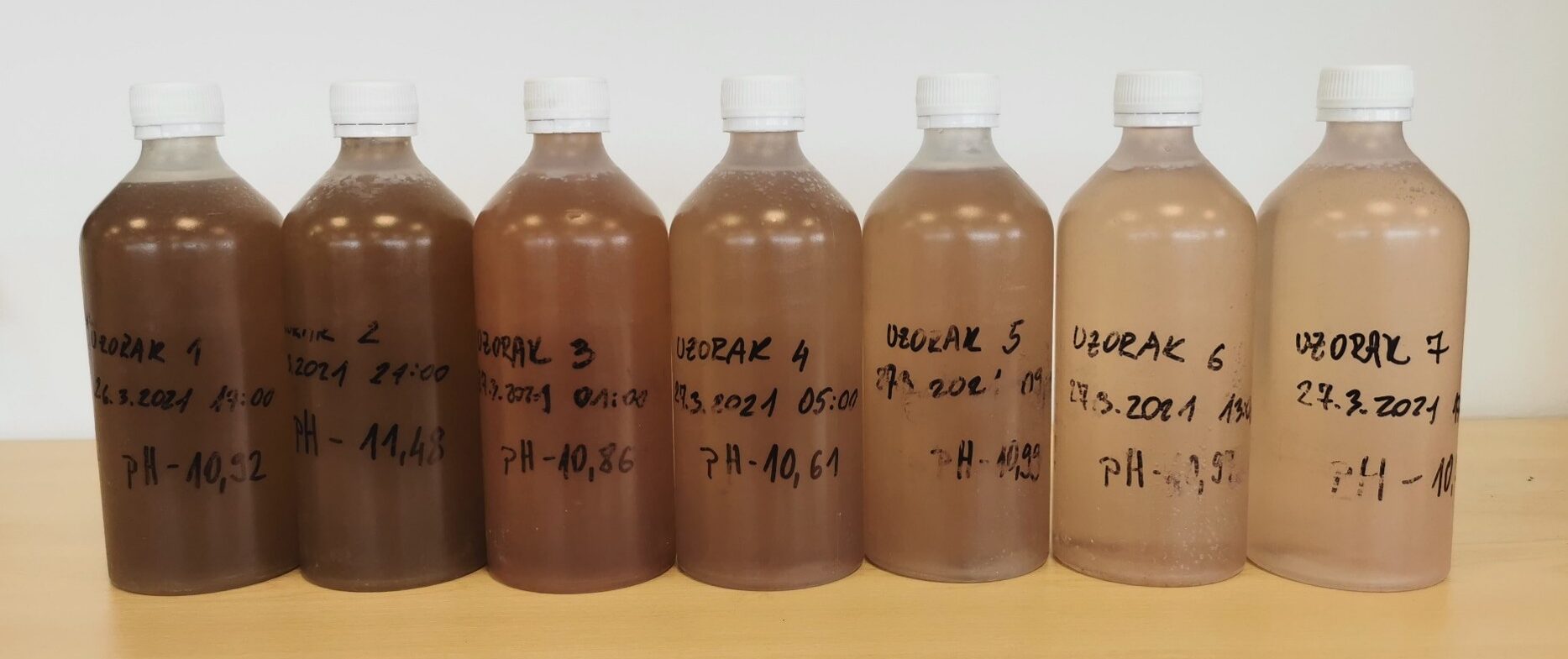 The progress of an alkaline boil-out can be clearly followed through systematic sampling and analysis. Parameters such as pH, conductivity, dispersant concentration (POC), and dissolved iron are tracked every few hours. As shown in the picture below, water samples gradually become lighter and cleaner, confirming both the removal of residues and the formation of a protective magnetite layer.